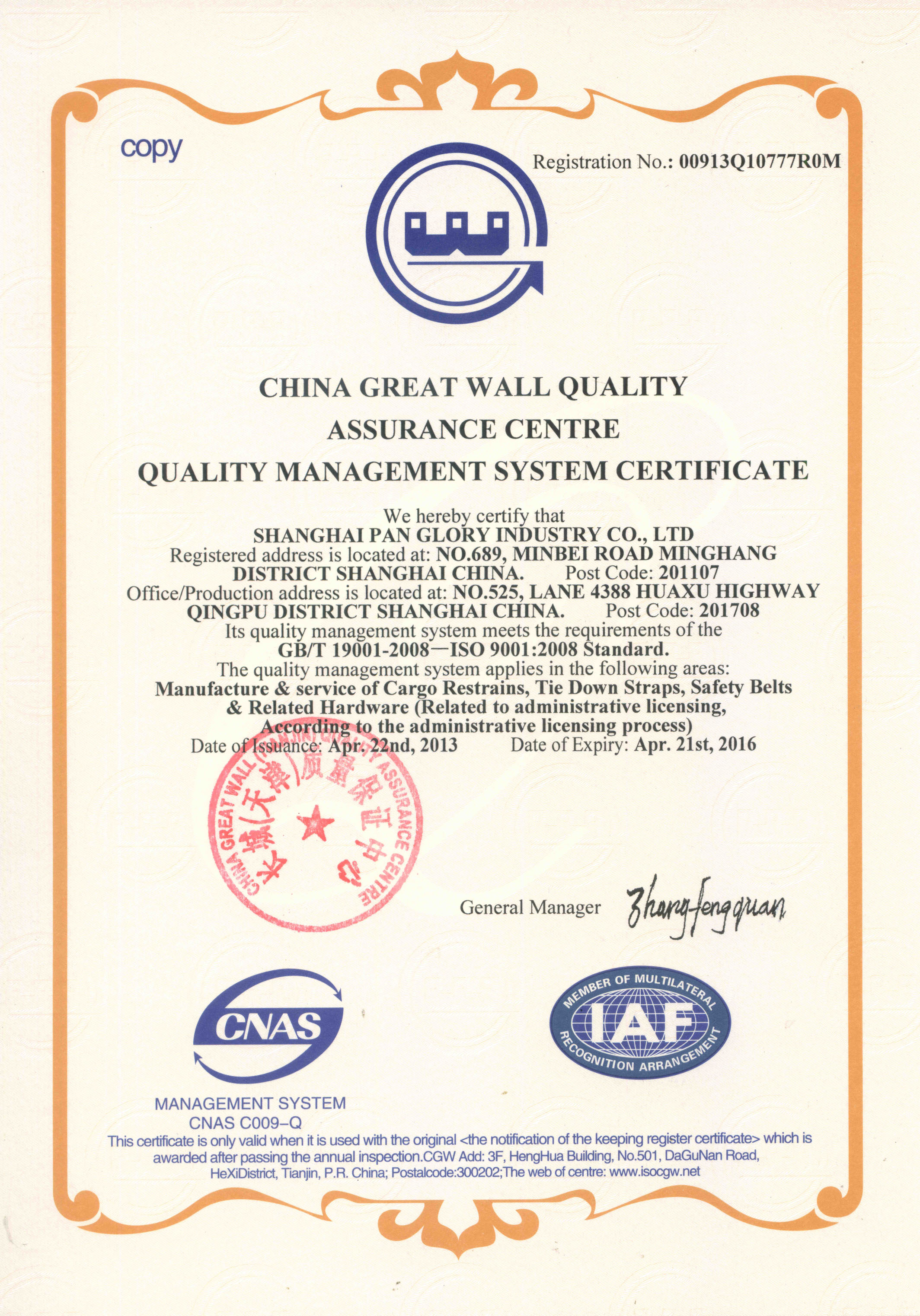 Shanghai Pan Glory Industry Co., Ltd. Is a member of the Web Sling & Tie-Down Association. All straps are sewn to the Association’s specs. All straps have the WSTDA certificate sewn in, along with the maximum and working load limits